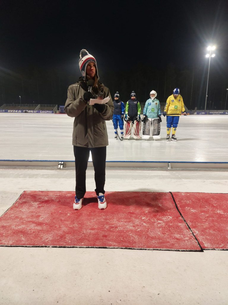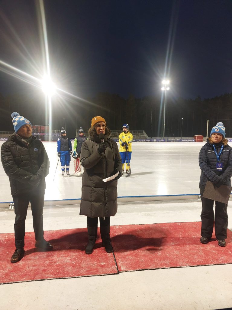 Attila Adamfi, General Secretary of FIB together with Minna Heikkilä, Director of Communications in Pori and Carla Björndahl, Vice President of the Finnish Bandy Federation.